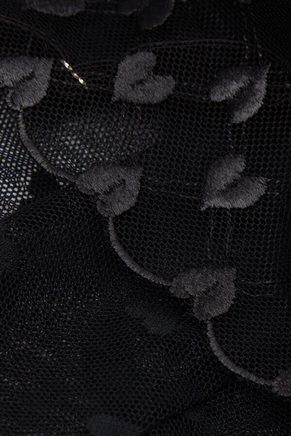 affascinante babydoll in romantico tulle con motivo a cuori impreziosito da sensuali rifiniture in raso e tulle ricamato a cuori. il cinturino in raso è removibile e può essere utilizzato anche come malizioso girocollo o accessorio per capelli.