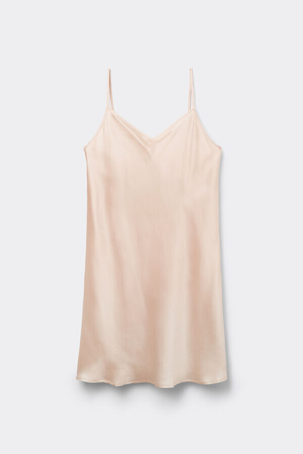 Vestaglia in seta liscia con spalline sottili regolabili e scollo a V discreto. Perfetta da indossare sotto gli abiti per una silhouette elegante. La modella è alta 1,75 m e indossa la taglia S.