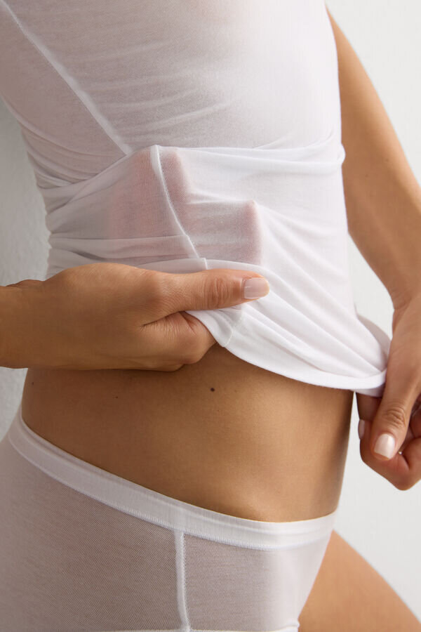 top in cotone ultraleggero elasticizzato, leggero e morbido, con effetto leggermente trasparente. avvolge delicatamente il corpo ed è ideale per chi cerca un capo particolarmente fresco e comodo, soprattutto nelle giornate più calde.
