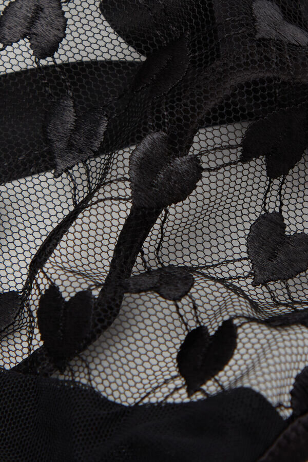 Thong in romantico tulle ricamato a cuori e sensuale rifinitura in raso. il cinturino in raso è rimovibile e può essere utilizzato anche come malizioso girocollo o accessorio per capelli.