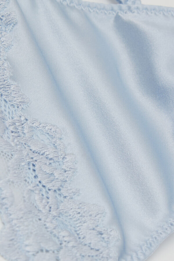 Thong in raso di seta elasticizzato impreziosito da un romantico pizzo ricamato a fiori. Motivo a triangolo sul retro impreziosito da un ciondolo a forma di cuore con strass.
