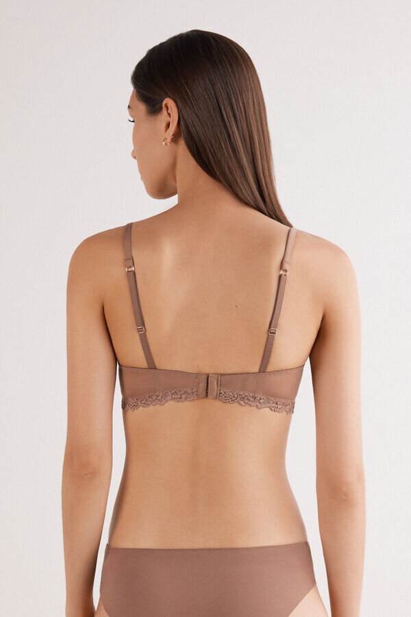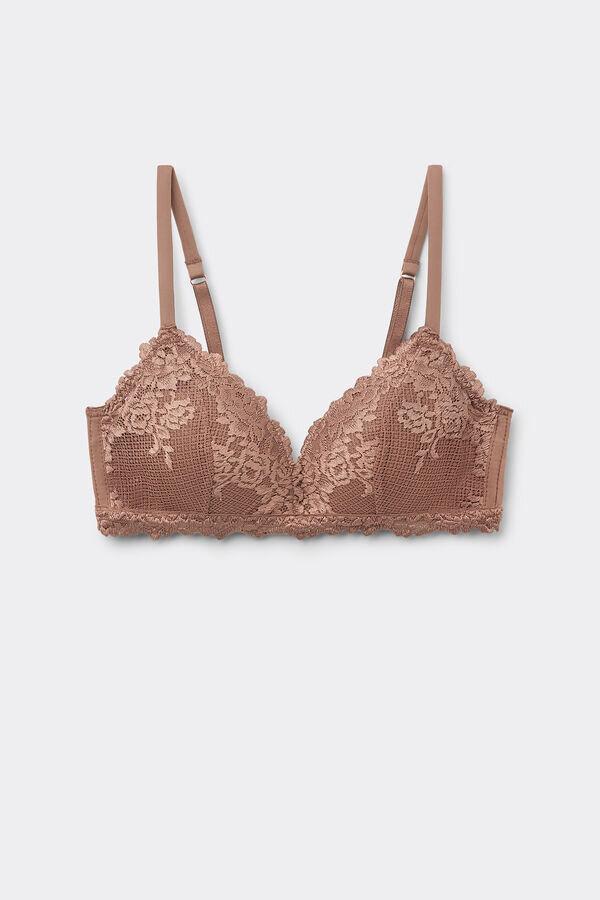 reggiseno a triangolo senza ferretto tiziana con coppe leggermente imbottite e stecche laterali che modellano delicatamente il seno. è realizzato in un sofisticato ed elegante pizzo elasticizzato con ricami floreali tono su tono o in contrasto, a seconda della versione presentata. le spalline sono foderate in microfibra e regolabili sul retro. Questo reggiseno modella delicatamente il seno e offre un sostegno leggero.