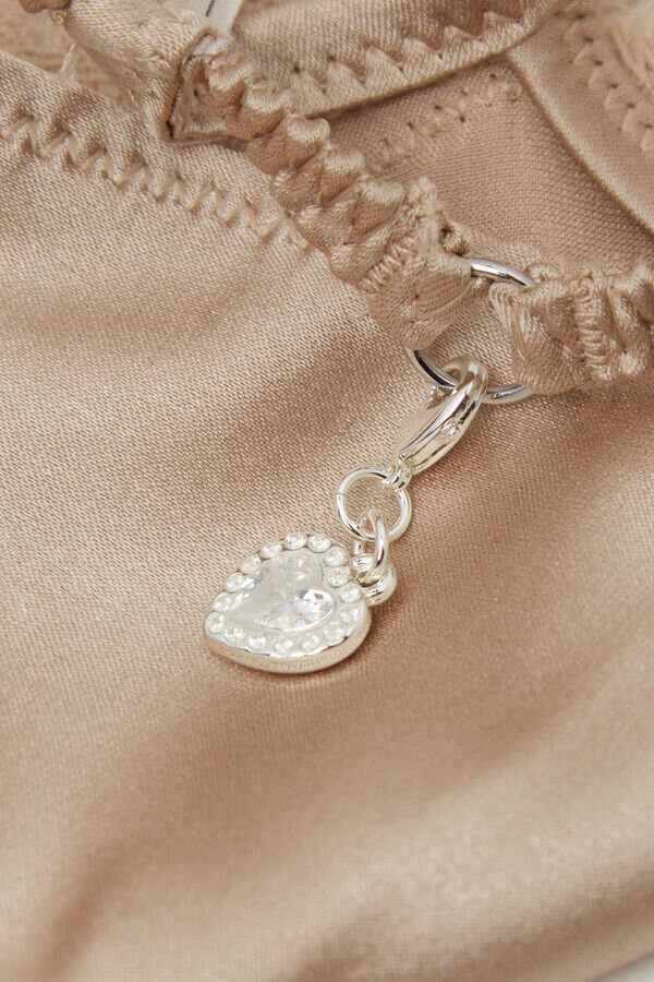 Thong in raso di seta elasticizzato impreziosito da un romantico pizzo ricamato a fiori. Motivo a triangolo sul retro impreziosito da un ciondolo a forma di cuore con strass.