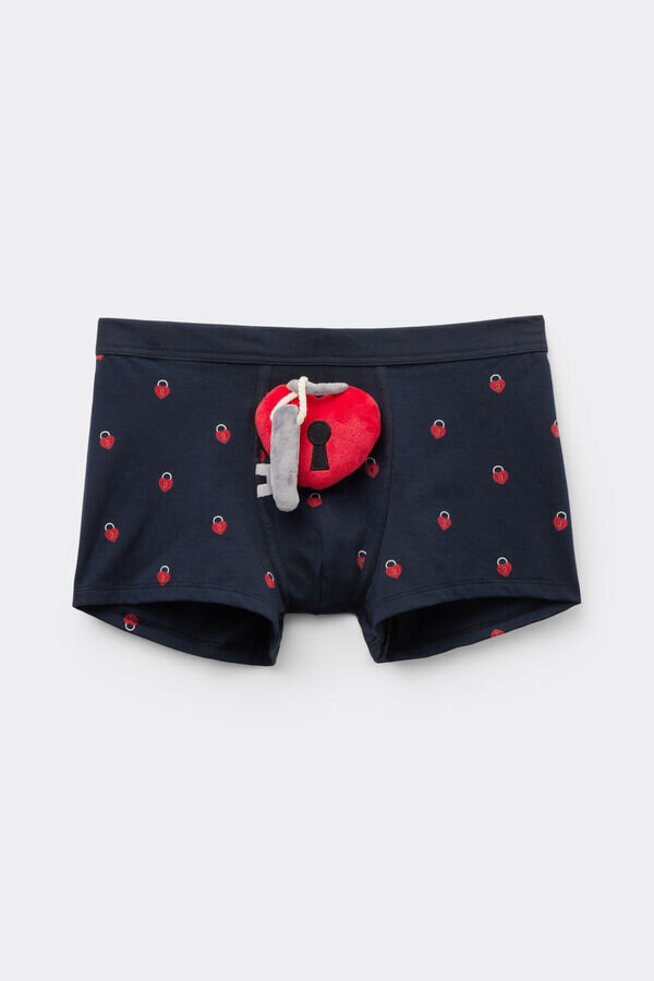 boxer da uomo in morbido cotone elasticizzato leggero di qualità superiore con stampa padlock heart su tutta la superficie. un romantico padlock heart con un peluche a forma di chiave è attaccato al pouch.