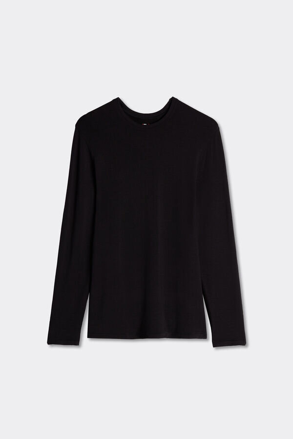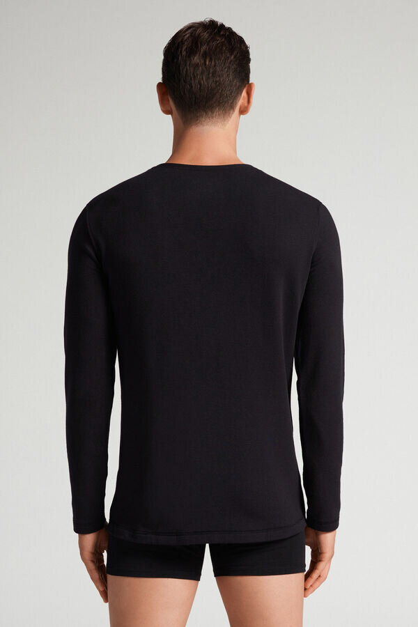 maglia da uomo a maniche lunghe e collo rotondo in misto modal-cashmere. incredibilmente morbida e confortevole. il modello è alto 185 cm e indossa la taglia l. in vendita nei negozi Intimissimi man.