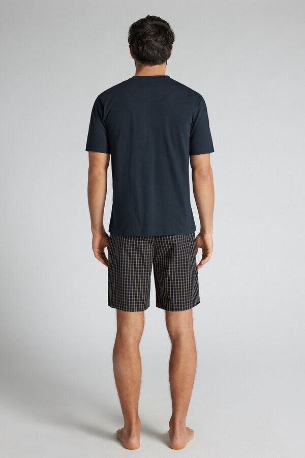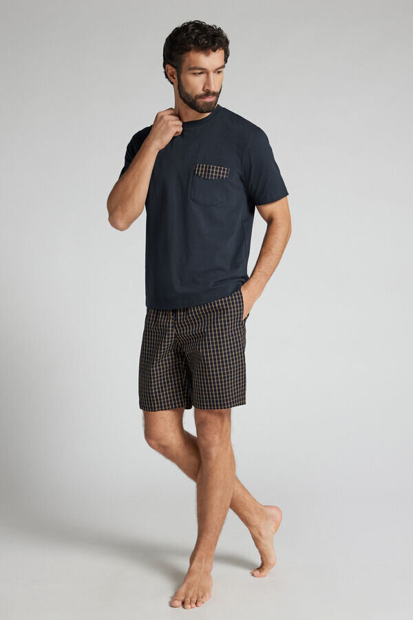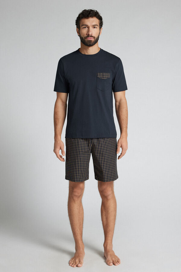 pigiama corto con morbida camicia in jersey di cotone tinta unita con tasca con bordi in tessuto a quadri. pantaloncini in tessuto di cotone a quadri.