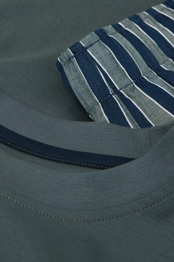 pigiama lungo con morbida camicia in cotone mercerizzato premium tinta unita con tasca con bordi in colore a contrasto. pantaloni lunghi in cotone a trama semplice a righe.